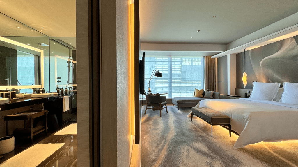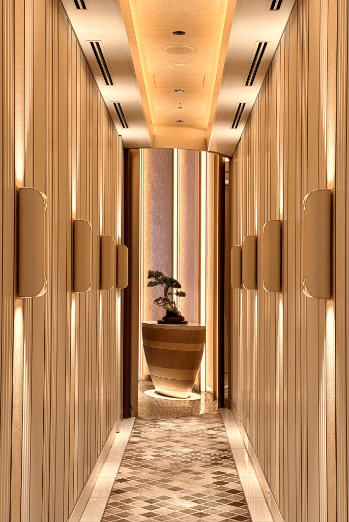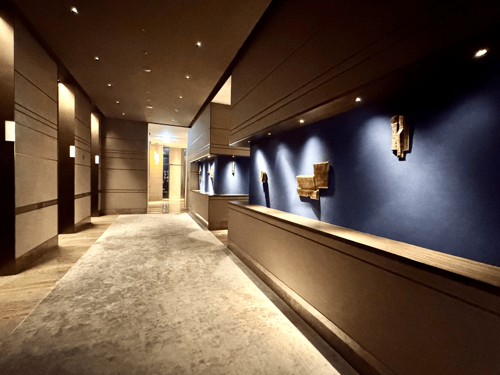往住房樓層的電梯廳,同時也是過渡走廊空間,在整體空間敘事裡扮演「情緒緩衝」與「節奏轉場」的重要角色。儘管不是核心展示區,卻恰恰體現高端酒店設計中「每一處皆被設計」的理念。