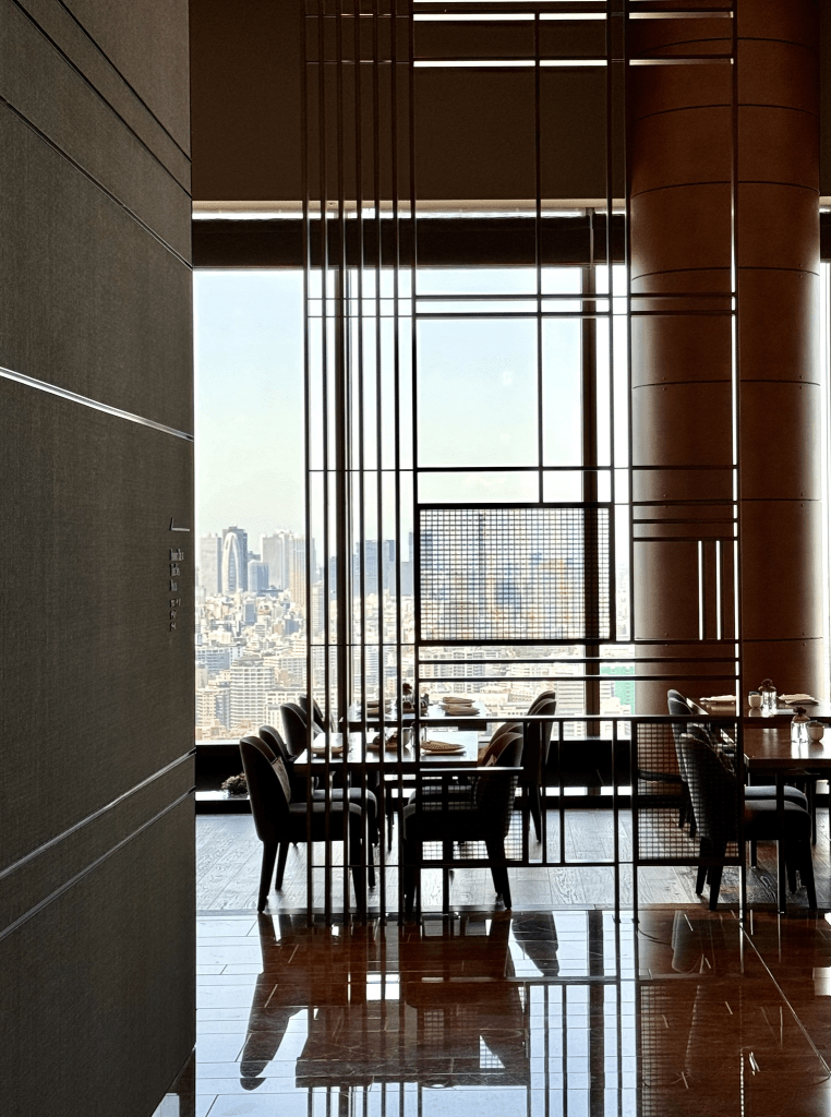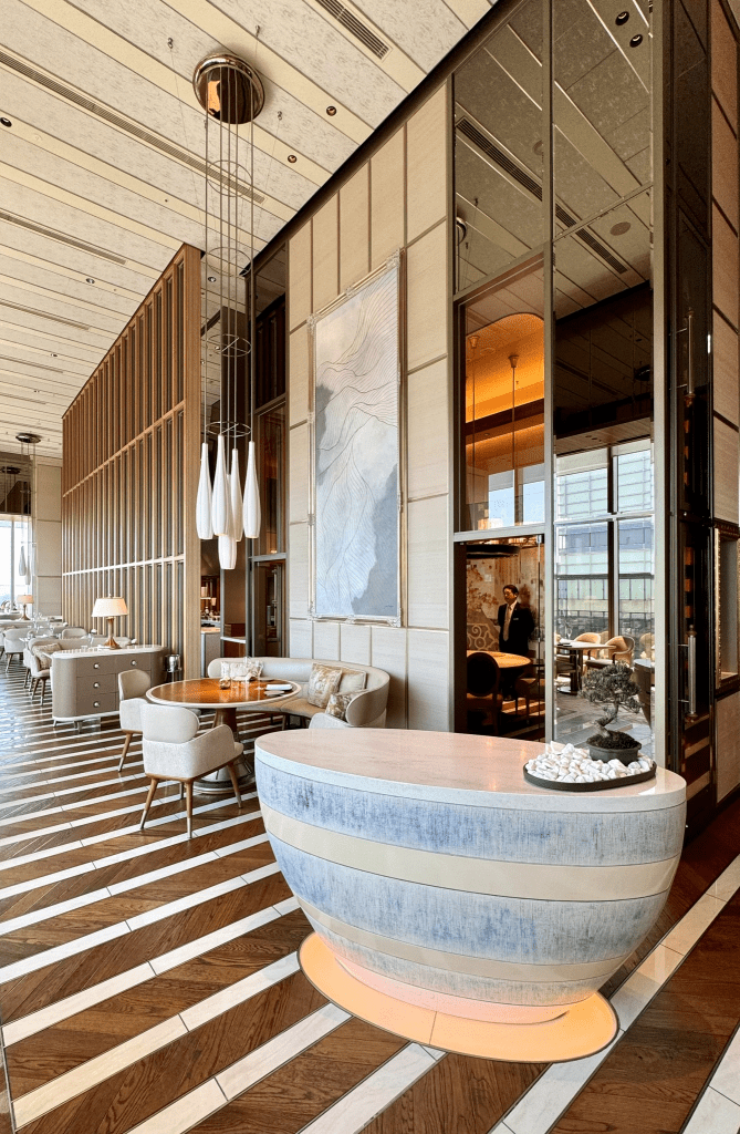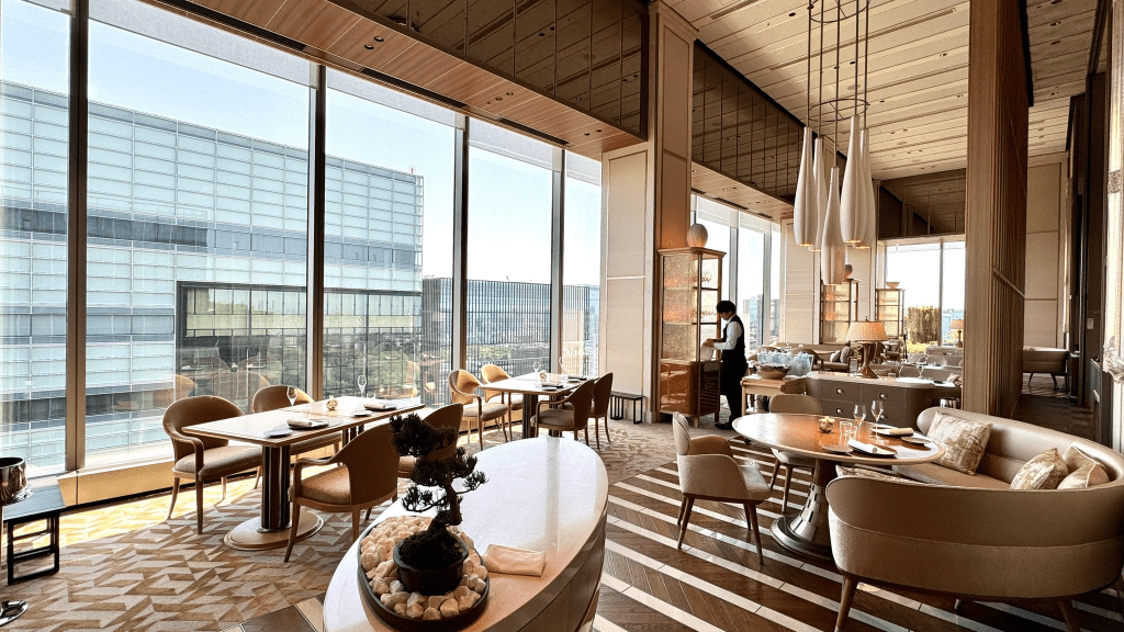 在酒店大堂、酒吧與餐廳等公共空間大量引入窗景設計,特別是能直接觀賞「皇居」與「富士山」的視野,是此案的重要亮點。Jean-Michel Gathy 將「景觀」視為裝飾的一部分,使得建築內外合一,營造「靜中帶景、景中有意」的氛圍。Gathy 在此案也延續其一貫的情緒設計(Emotional Design)理念,利用柔和燈光、深色石材與暖色調木作營造安心氛圍,讓空間設計如同敘事,從進入大廳、通往電梯廊道至客房,每一段動線都有不同的「節奏感」與氛圍轉換。