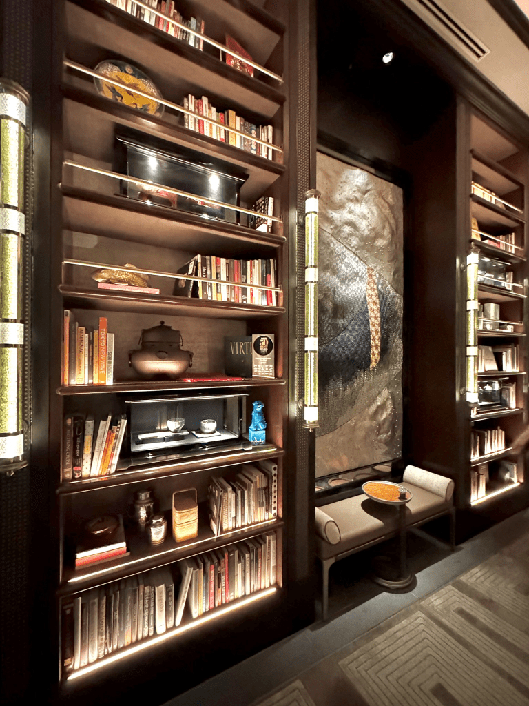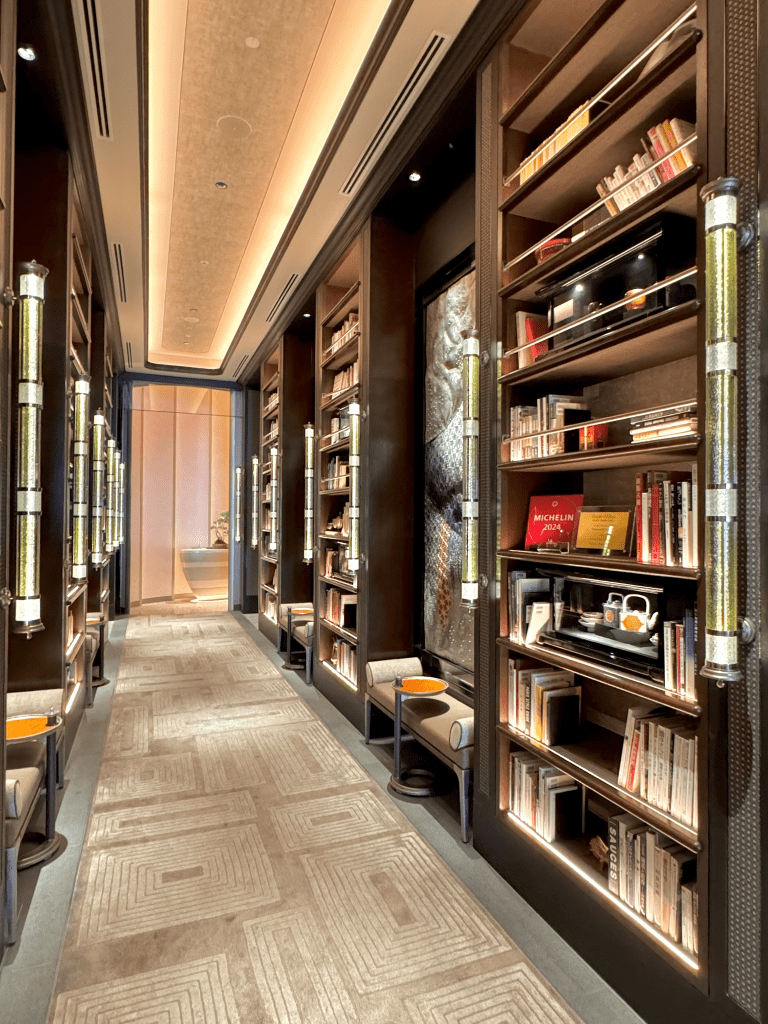 VIRTU酒吧及est法式餐廳的入口,將原本僅作通行的走廊空間,透過書牆老件擺飾與閱讀座位配置,轉化為可停留、觀察、交談的「文化過道」