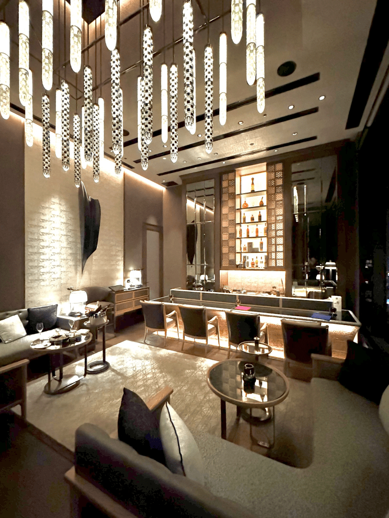 酒吧入口深具儀式感與奢華視覺語彙,融合藝術性、幾何秩序與燈光戲劇效果,充滿Art Deco與現代精緻風格的混搭。