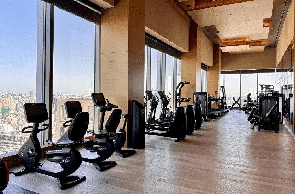 設備齊全的健身房透過落地大窗,將皇居和城市景觀盡展眼前。