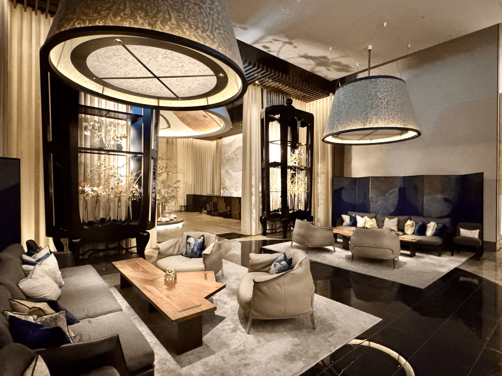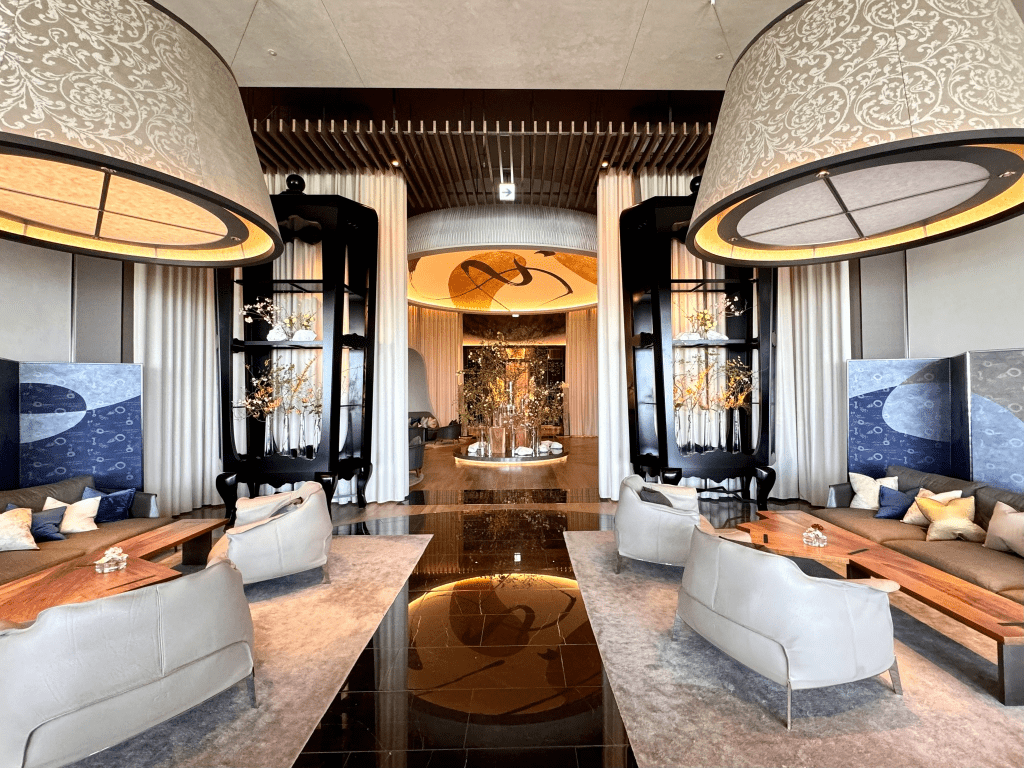 進入接待櫃檯前的LOUNGE空間, 兩盞巨型燈罩以歐式宮廷風圖騰裝飾,尺寸超規格處理,營造出壓場感與戲劇氛圍。左右沙發區與高背展示架鏡像對稱配置,傳遞出東方空間常見的「平衡美學」。