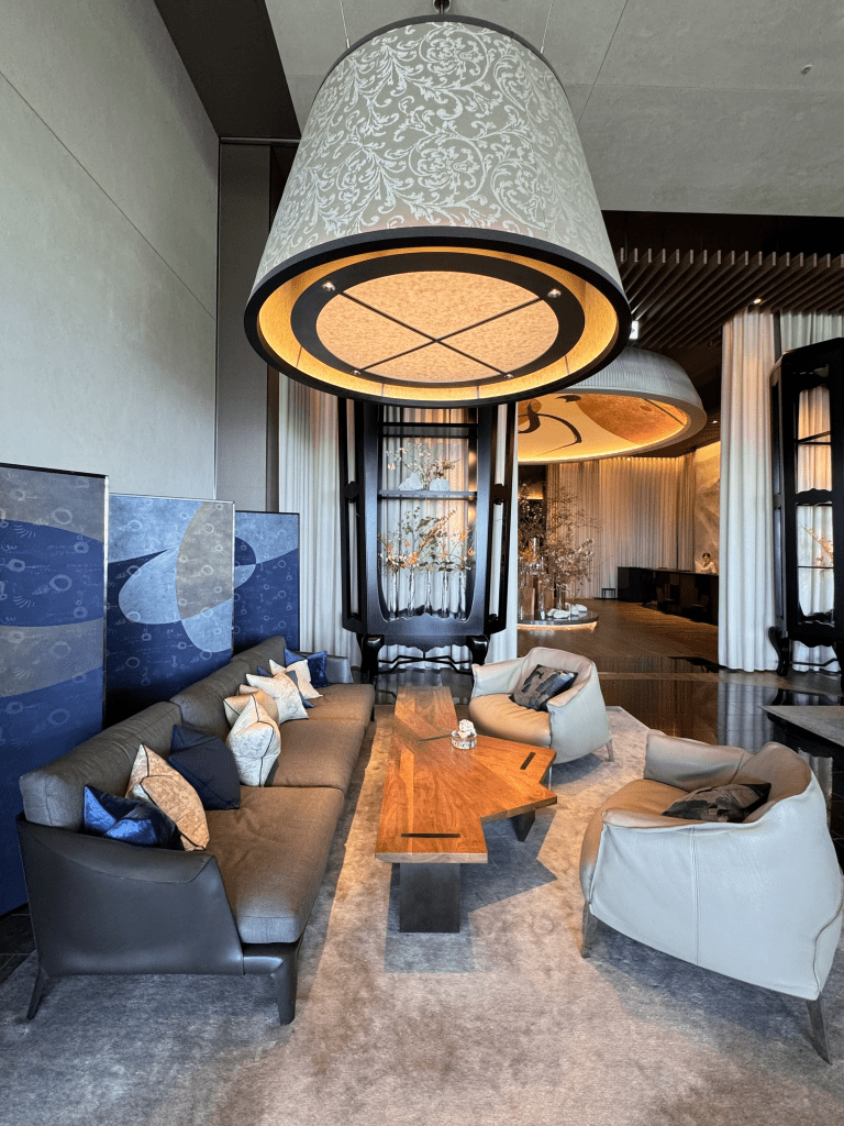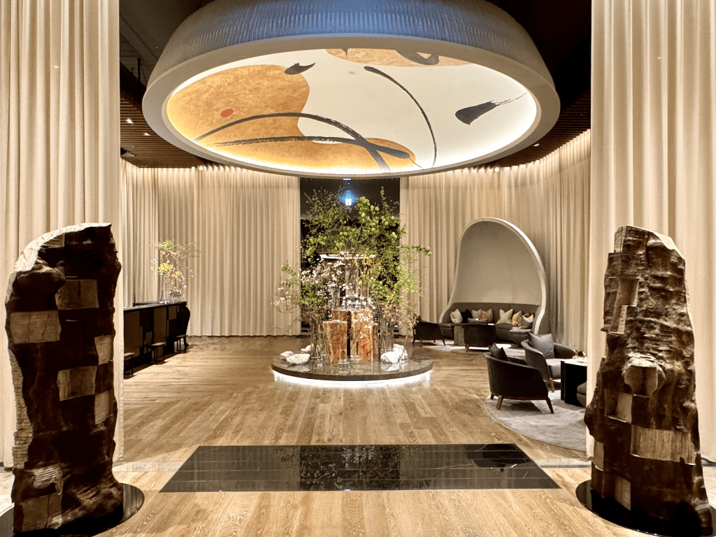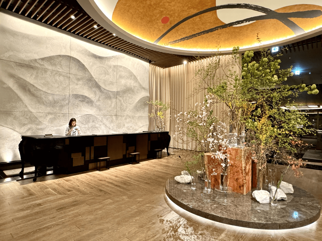 接待櫃台背牆的大型畫作呈現「雲氣流動」意象,呼應東方山水哲學,也可能象徵品牌的「靜謐、從容」形象