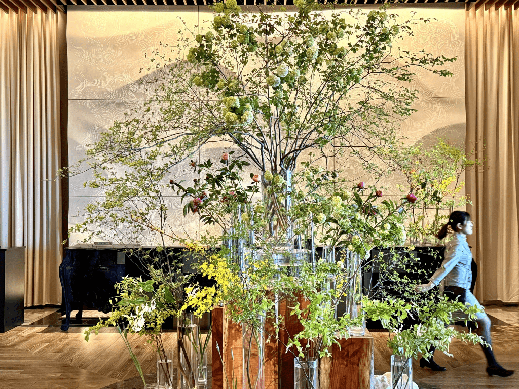 高低錯落的樹枝,花朵與不規則石材搭配圓形平台,形成一種自然即奢華的當代枯山水中心點,象徵迎賓與祝福。
