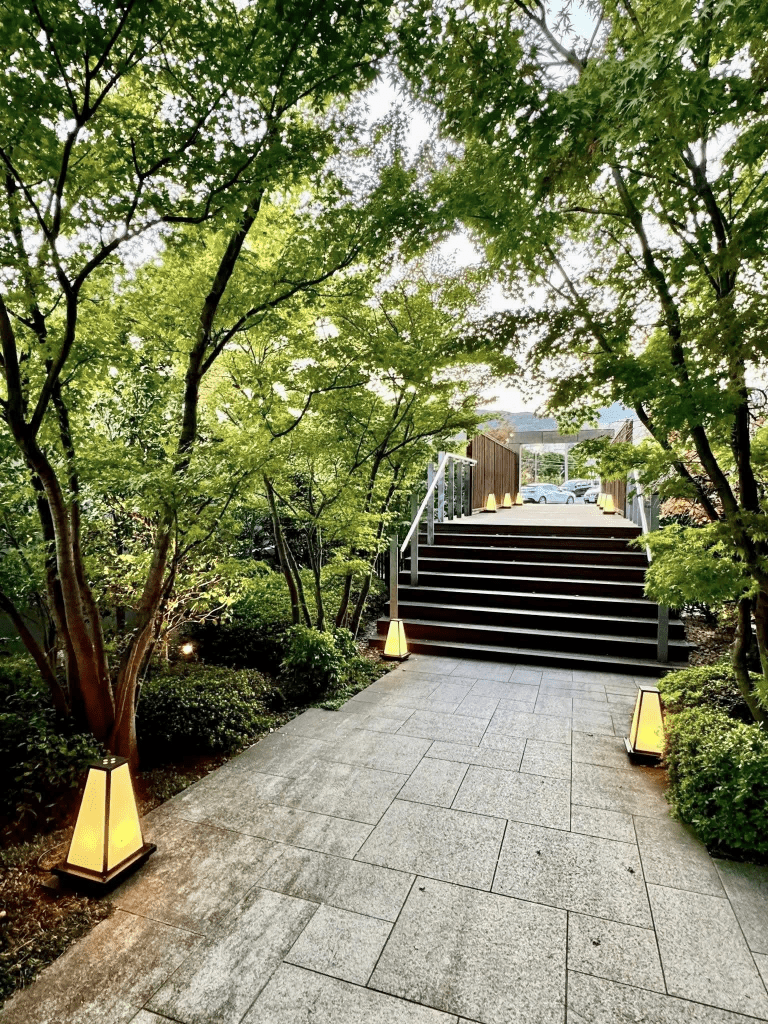 通往酒店大堂的石板小路,讓人帶著探索的心情前行,產生「轉場」的體驗。
