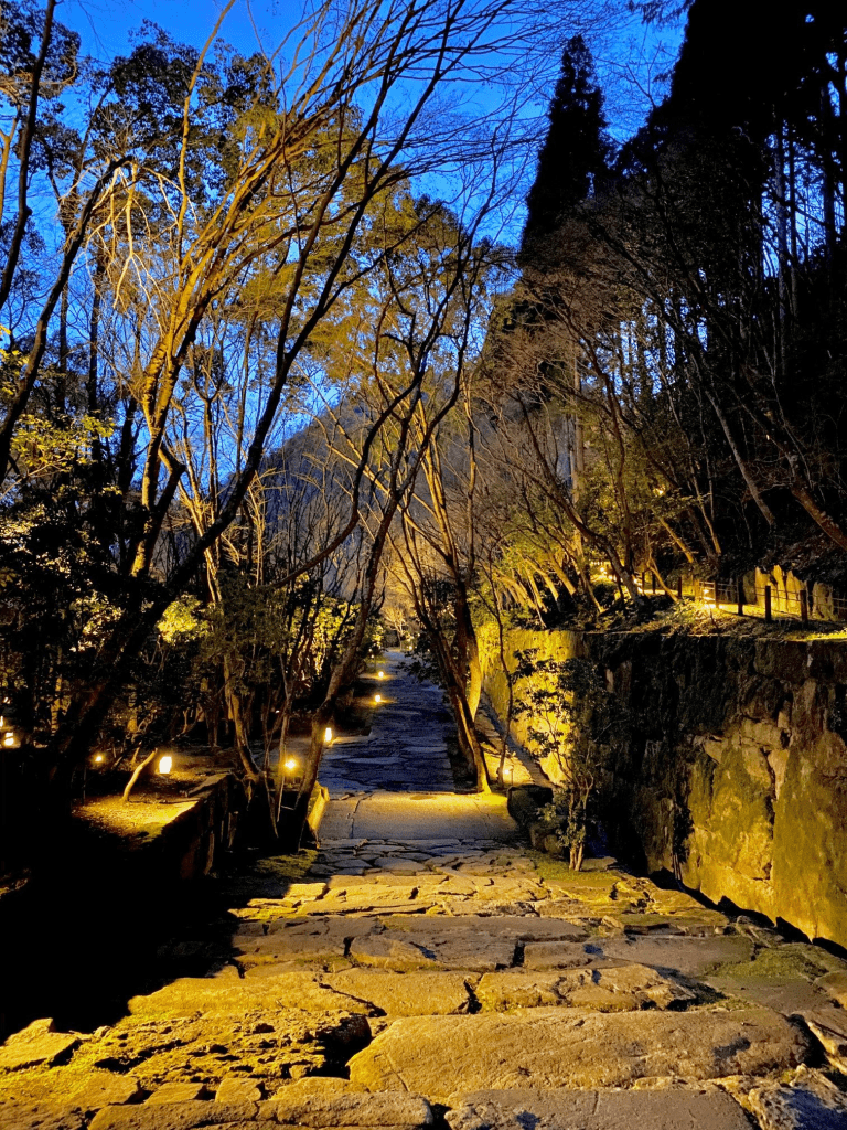天空的餘光,讓將近夜晚的庭園步道呈現另一種美感,在這裡,夜晚出門泡湯是要帶手電筒的,房間皆有配置。