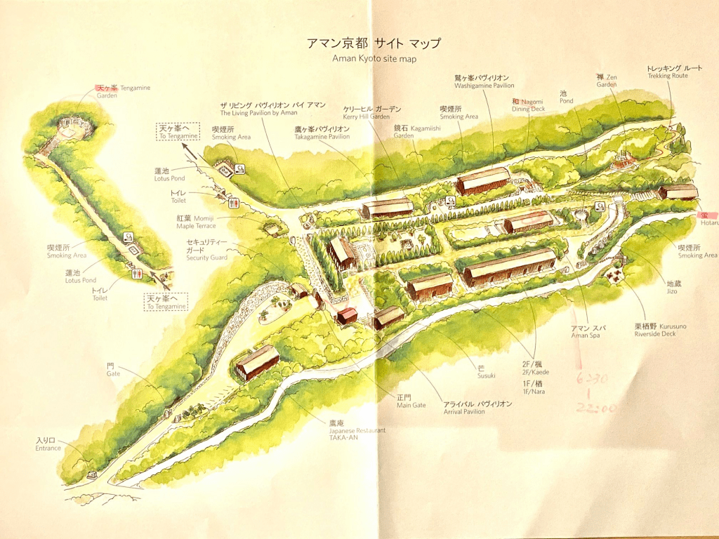 京都安縵占地約32公頃,包含29公頃的自然森林及3公頃酒店庭園,地圖中的標示簡單,鷹庵鐵板燒餐廳在入口處,其餘五棟為臥室建築物,一棟溫泉SPA、一棟餐廳。