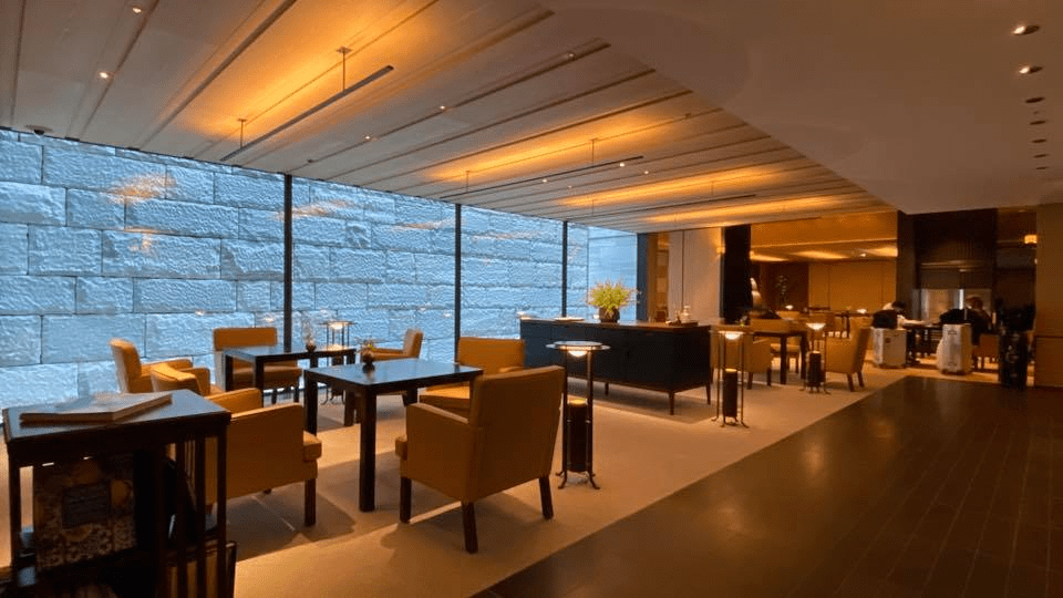 大廳的座位區,往窗外的景觀不是綠化,而是石頭堆砌的石牆.