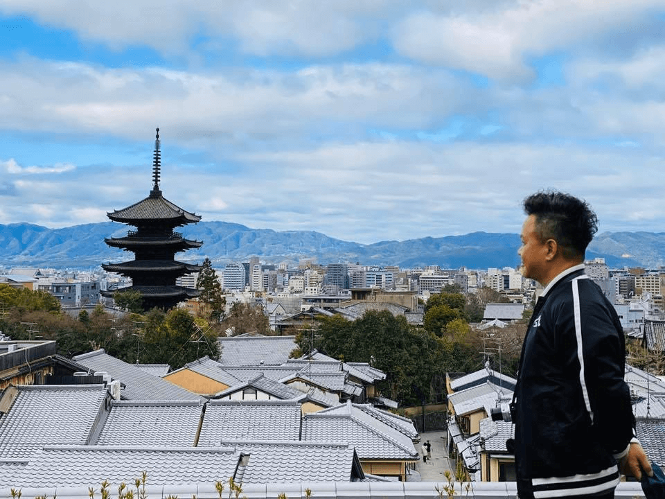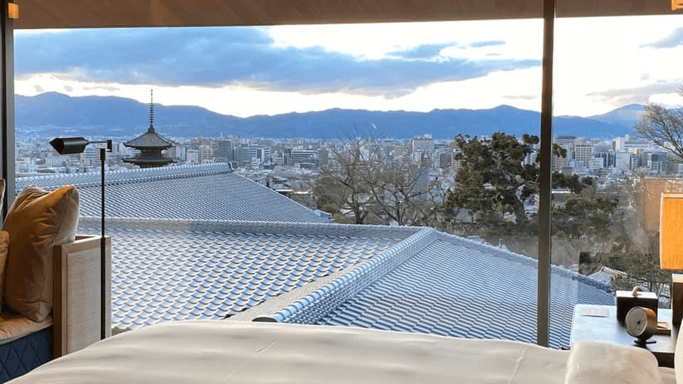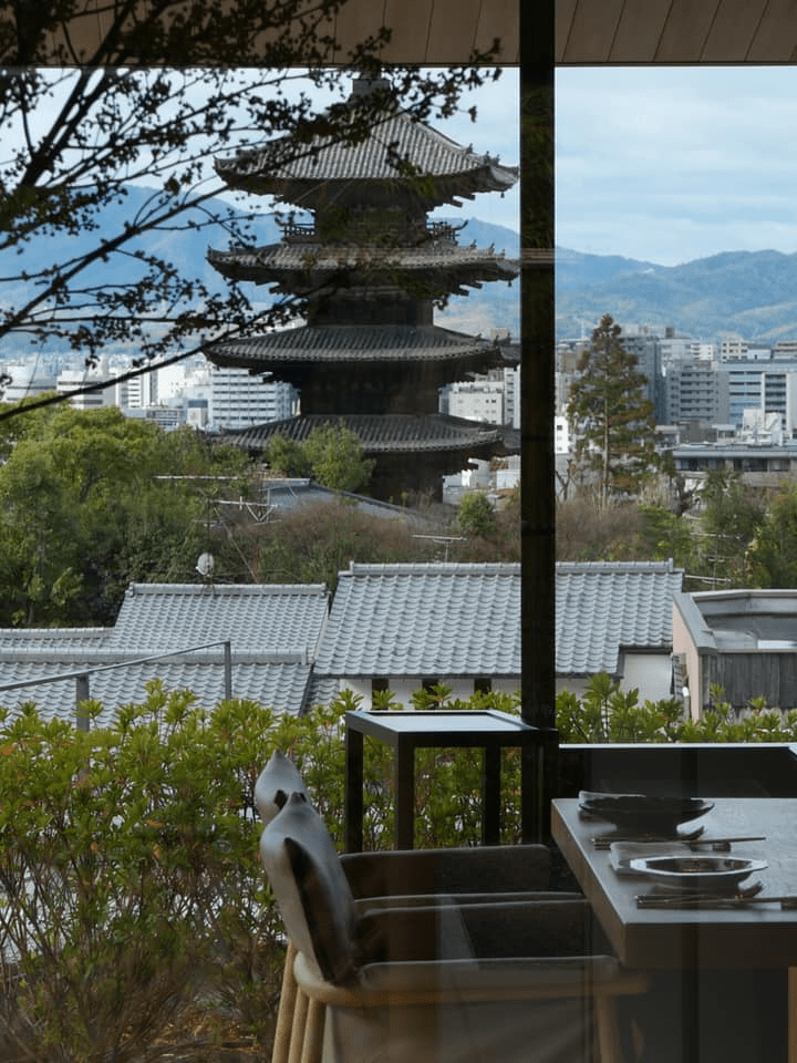 在酒店三樓的露台登高望遠,眼前是法觀寺的八坂之塔,京都的天際線也盡收眼底,