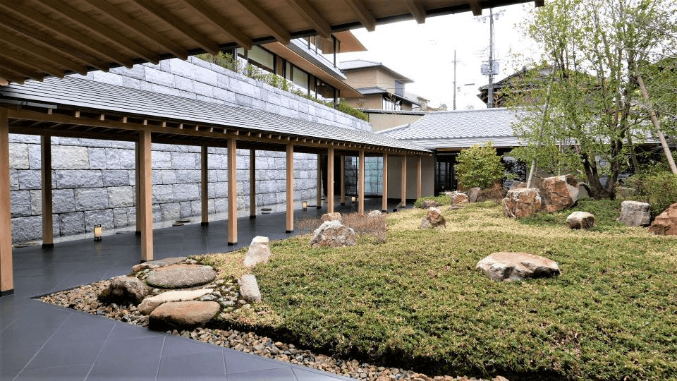 京都柏悅以小高層建築依山而建,呈現當代日式建築的靜雅之美。酒店入口以枯山水概念的景觀設計作迎賓迴車道。