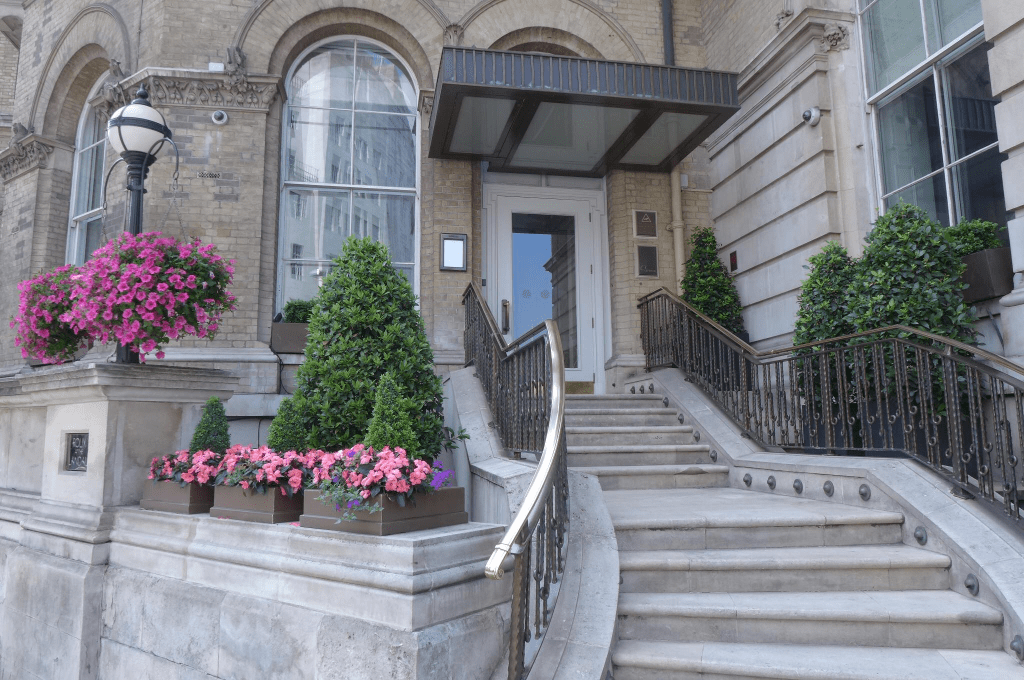 從酒店大堂往門口戶外看的角度,酒店的值班人員總是親切地站在門口迎接客戶到來。女性員工的制服由於採用呢絨及格狀編織,讓很多人誤認為是香奈兒的衣服。