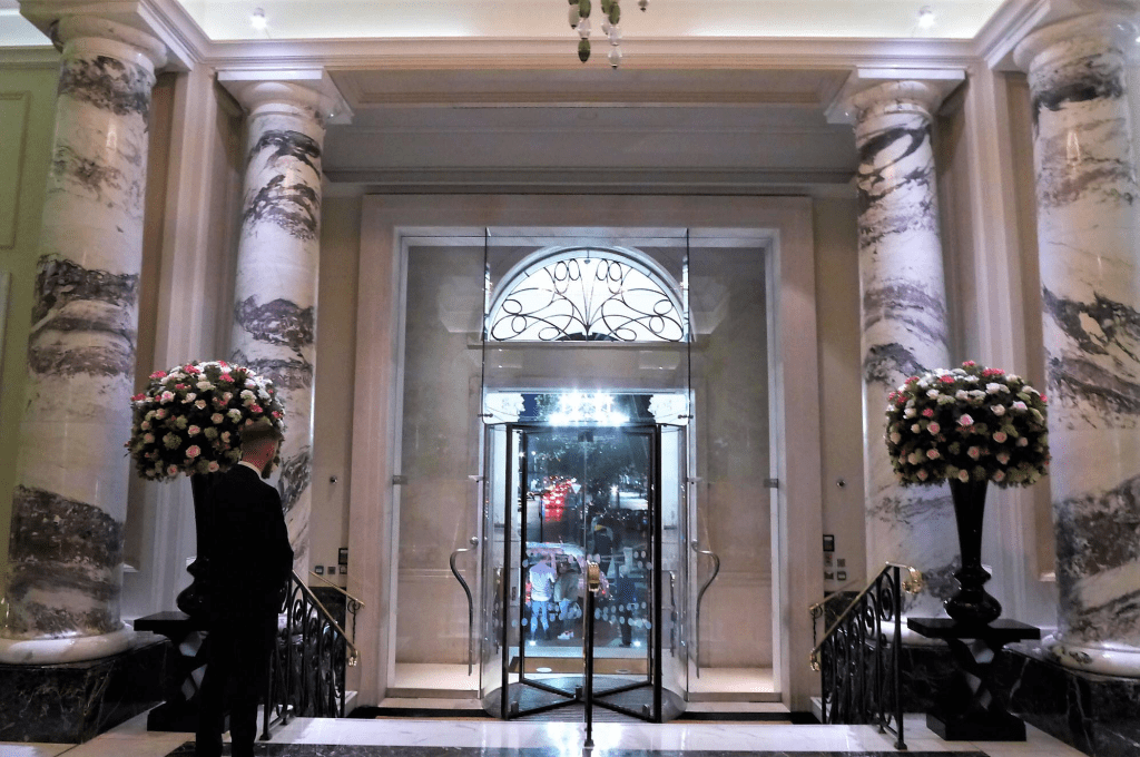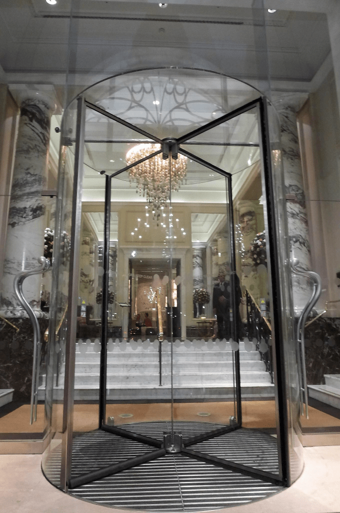 酒店入口採旋轉門設計,這在緯度較高的地區是相當實用的設計,當冬天寒風吹起,不至於直接進入室內