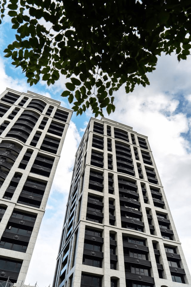 來自巴西的黃金石,搭配金屬造型鋁板,深凹窗設計,讓建築立面更加立體,也突顯材料的耐久特性及價值