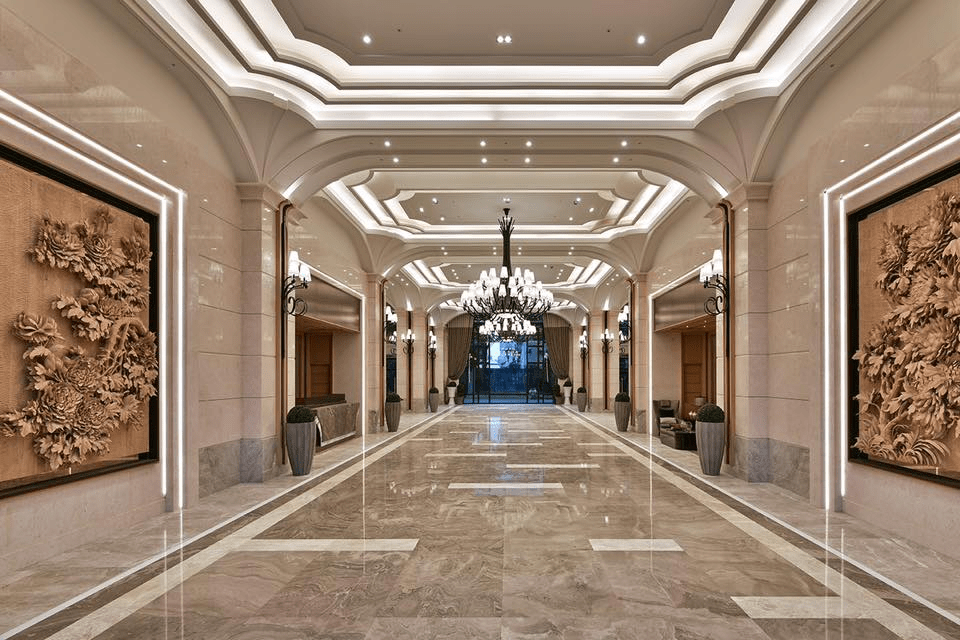 以左右兩側3*2米的實木木雕作為迎賓排場
