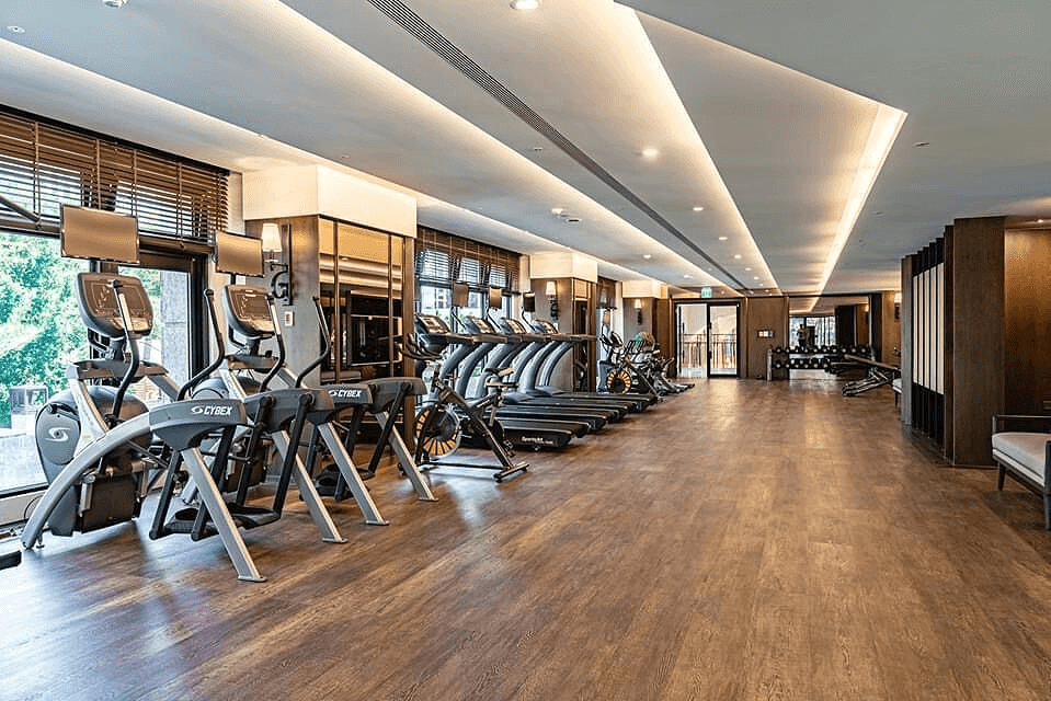 曼谷凱賓斯基酒店的健身房,木作及百葉的大量運用,打造溫暖的健身空間。