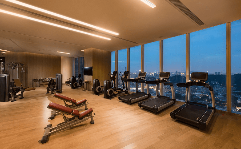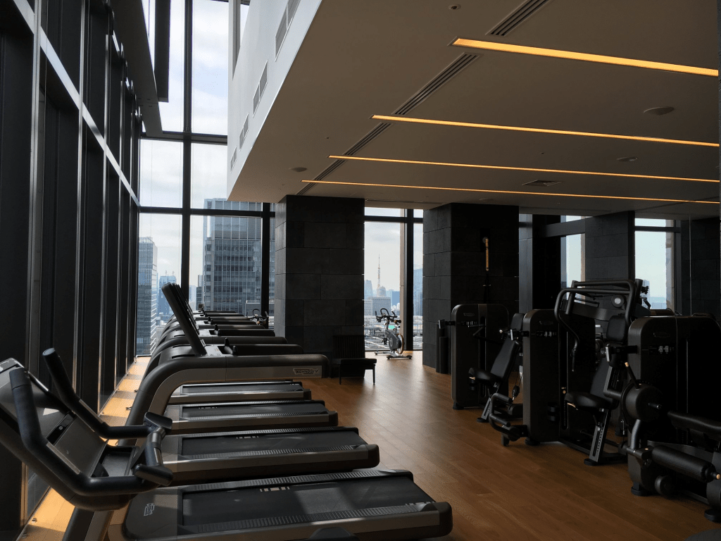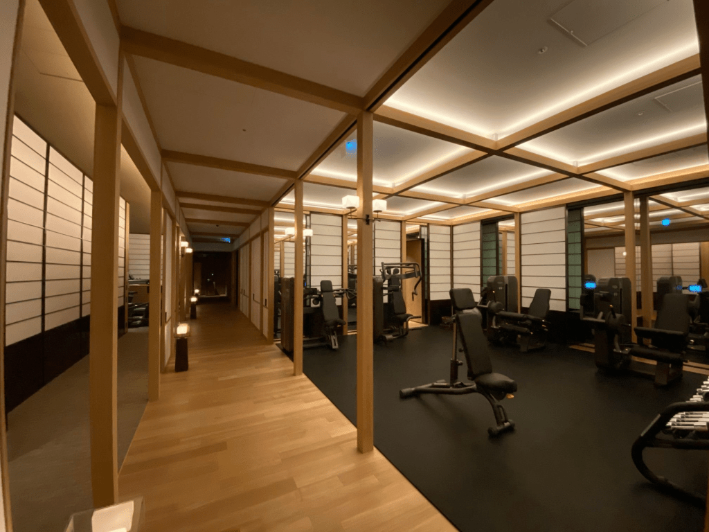 由國際知名大師季裕棠操刀設計的京都柏悅酒店,健身房空間也是有強烈的日式空間風格。