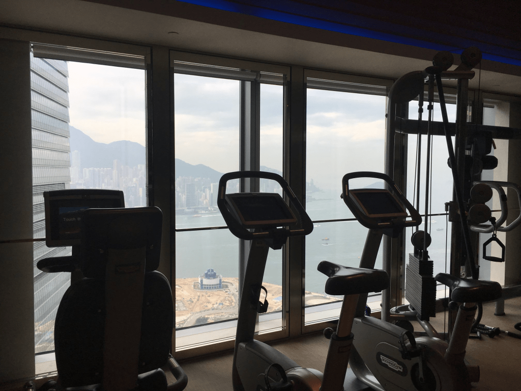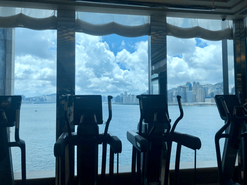 位於九龍維多利亞港邊的香港瑰麗酒店,健身房是面向維多利亞港,運動時欣賞著窗外美景,這景色可是得花錢買的,能enjoy 多少算多少。